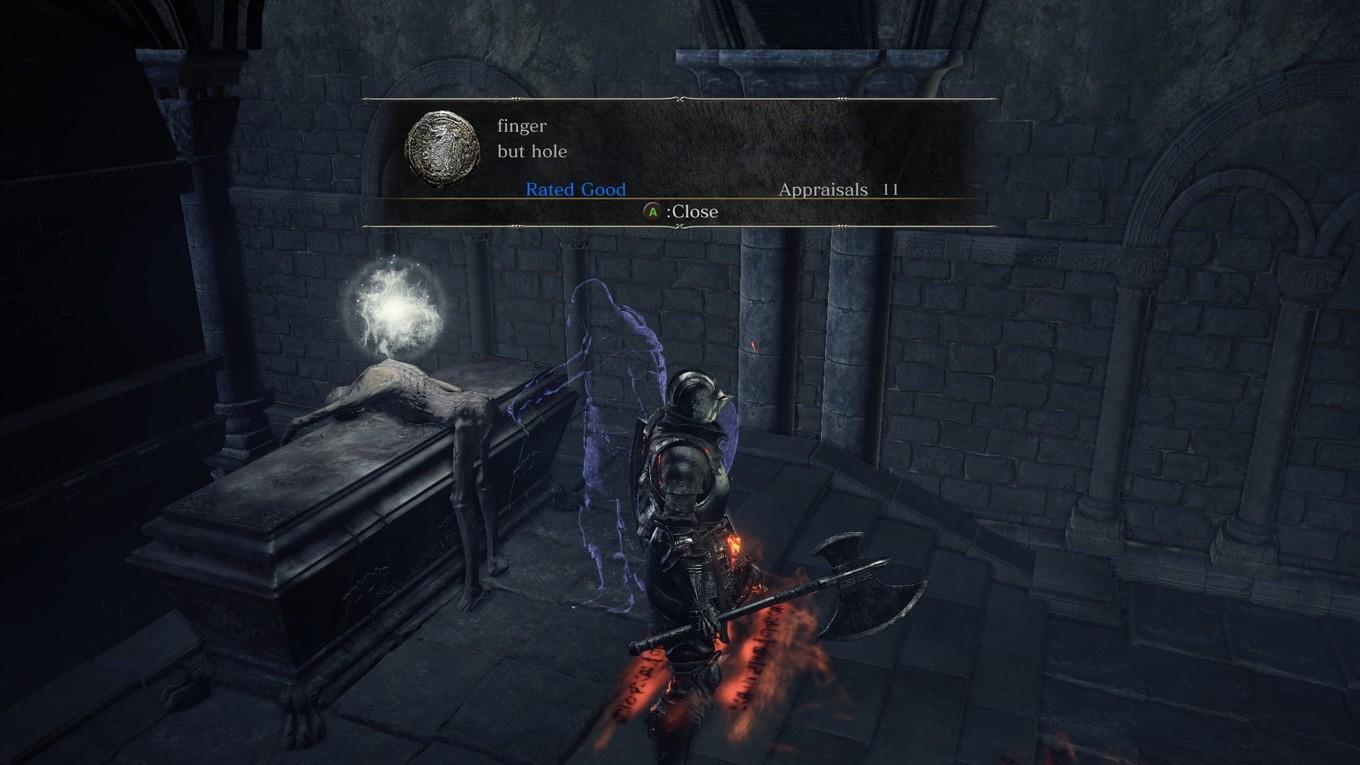 I didn't spend much time doing PvP in this game. At this point, the tryhards were out in full force on Day 1, screeching about which builds were ABSOLUTELY INSANE and herding players into mashing R1 all the time. The most disappointing thing about this was: it worked. It revealed that being particularly inventive about your character build or playstyle was getting you needlessly killed. This marked a decline in my enjoyment of these games for a long while.