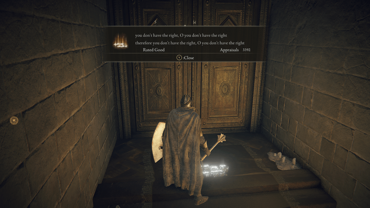 But! You push through it all, and arrive in Leyndell! You fight through another dense, difficult area, fighting the increasing urge to run straight through and just get on with it. You have a visually engrossing, loud fight with a Very Important Dude - three separate ones, actually. And for being this late in the game, you think, the reward must be enormous. What you actually receive is: the Erdtree tells you to fuck off. Go to this brand new area and figure shit out. It's an overwhelming let-down.